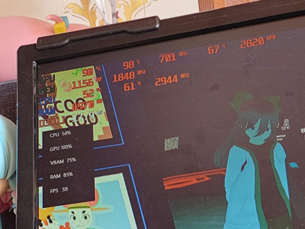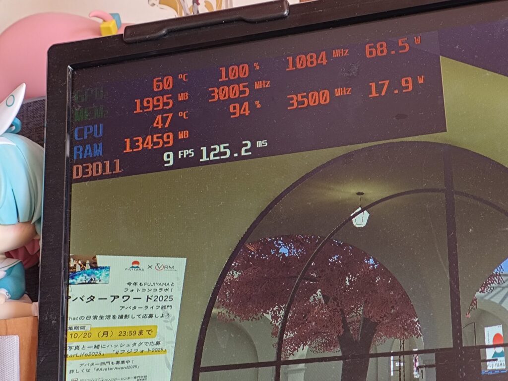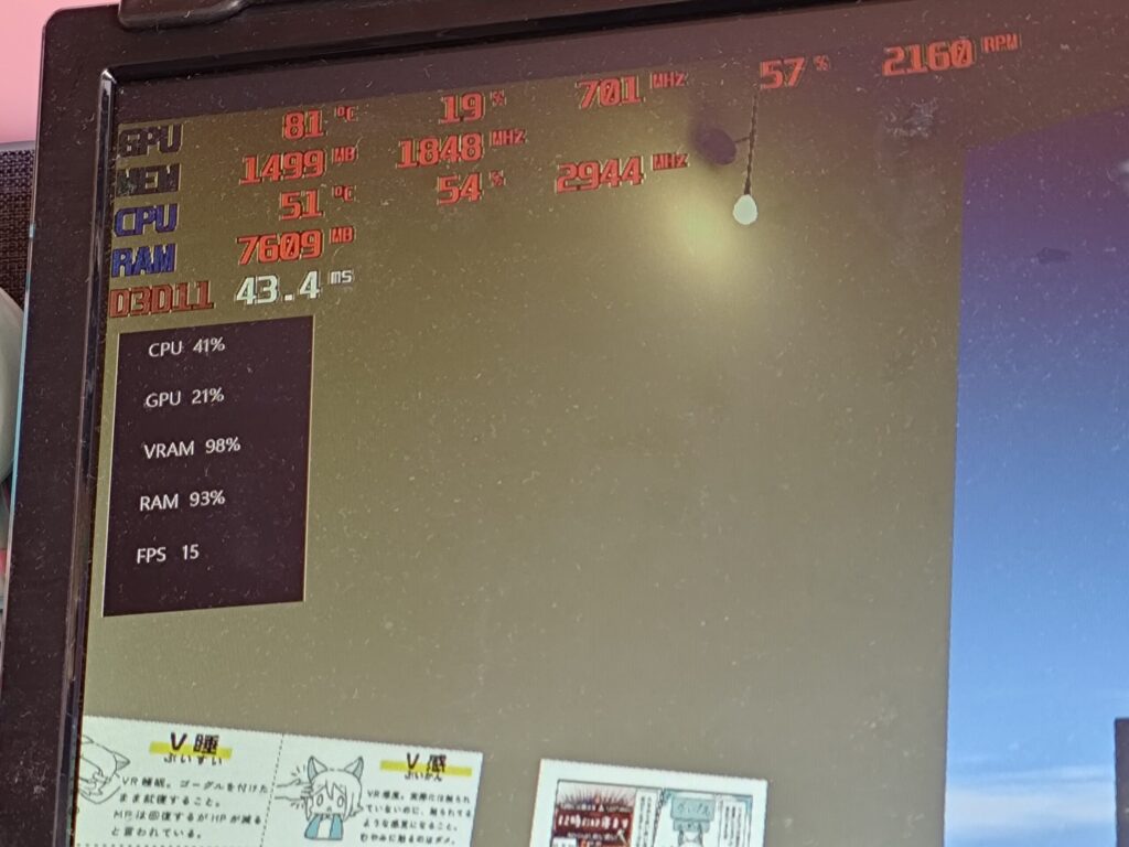 VRAM使用率はMAX、RAMもほぼマックスで15fpsほど。重たいです