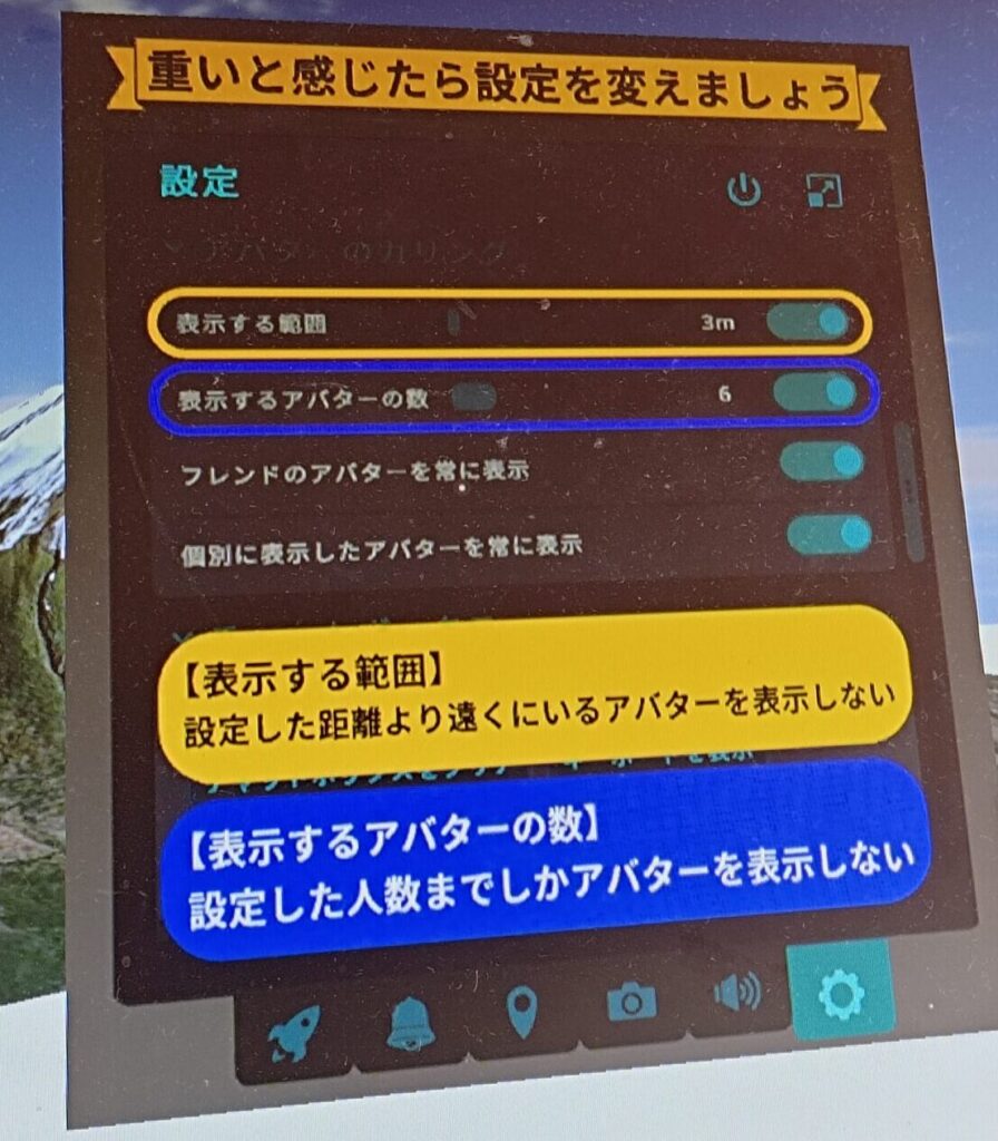 (ほかのユーザーさんの迷惑の可能性を考えて写真は最低限です。設定は鏡以外低設定アバター読み込み初期設定)