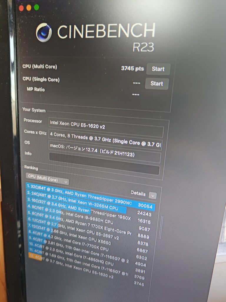 ベンチ結果の比較は以下の通りです。コア数の暴力でメインPC(12100f)に匹敵するほどの性能を出していてすごい。