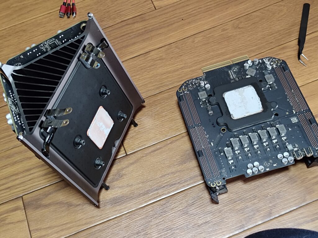 CPUをボードに固定する=>グリスを塗る=>CPUボードをクソデカヒートシンクに固定する