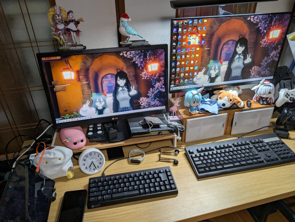 いままでサブモニターが1366*768だったので両方ともFHDになり作業面積が広がって神です。キーボードを2個並べられるのも最高。また執筆が捗りそうだw