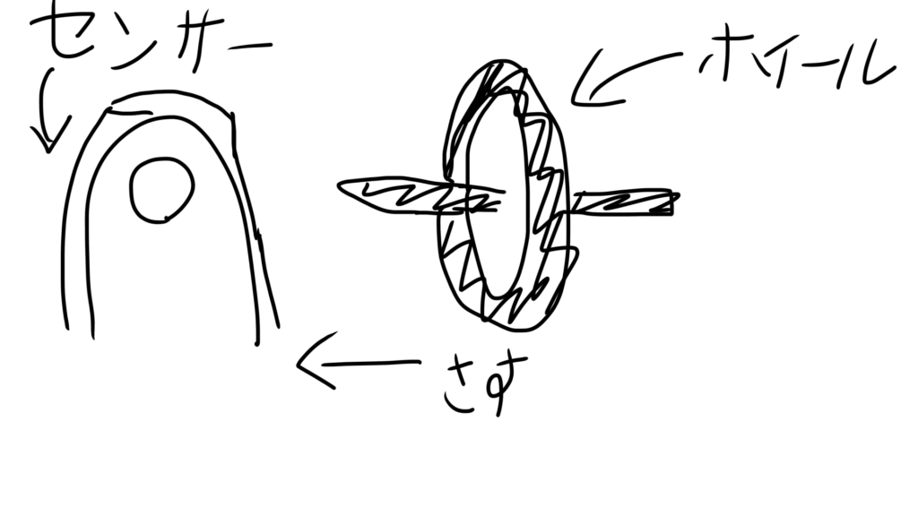 簡単なイラストで説明しますと、回転を検知するセンサーにホイールの軸を差し込んで回す、という方法でホイールは機能しているわけですが、