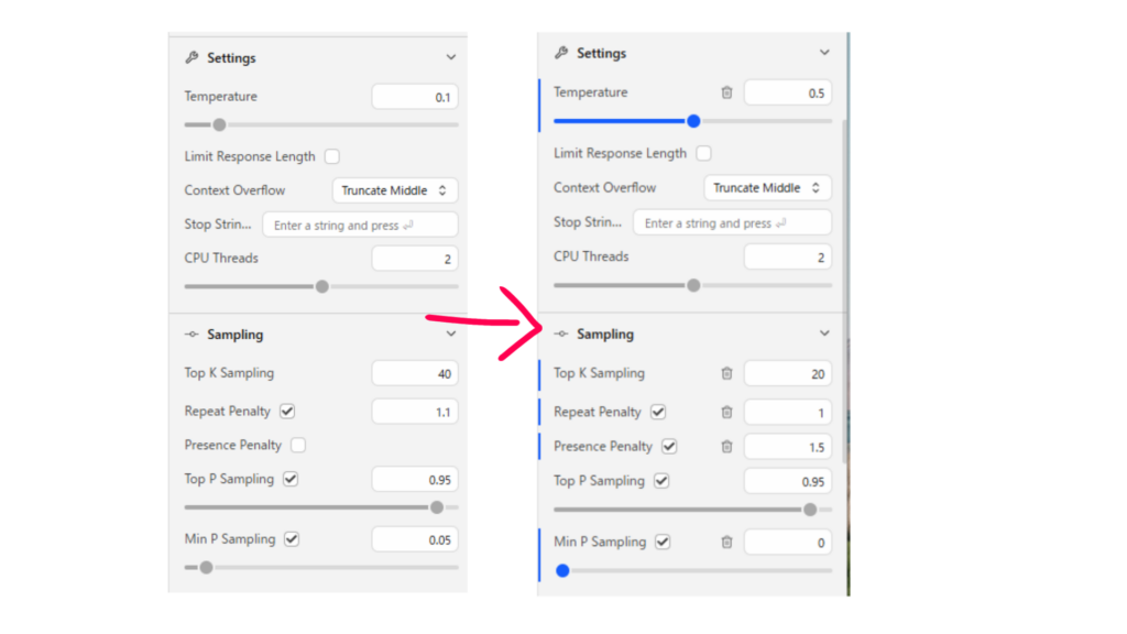 presence penaltyは「値が高いほど出力に同じトークンが出てきにくくする設定」で、これで同じことを考えてループになるのを防ぎます。1.5だと出力がテンプレ化してしまうので1.4くらいにしておくといいかもしれません。