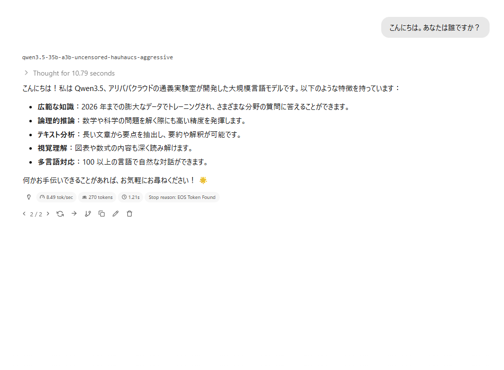 使用モデル HauhauCS/Qwen3.5-35B-A3B-Uncensored-HauhauCS-Aggressive Q3_K_M