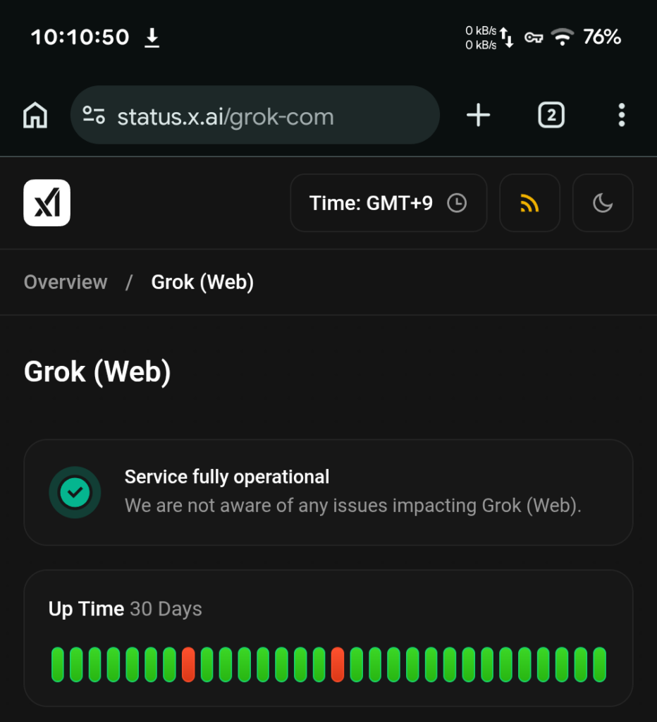 grokに障害が発生している可能性も考えられますが、ステータスは緑色、、、。