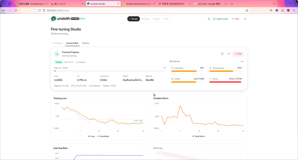 で今回unsloth studioという「GUIから簡単にFTできるツール」が登場して、さらに自分がAI用パソコンを組んだのも相まって「ローカルでやってみたらいいんじゃね!?」と思いやってみたというわけです。