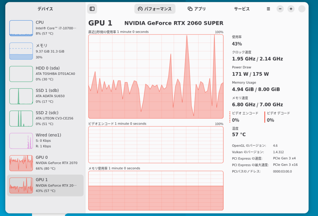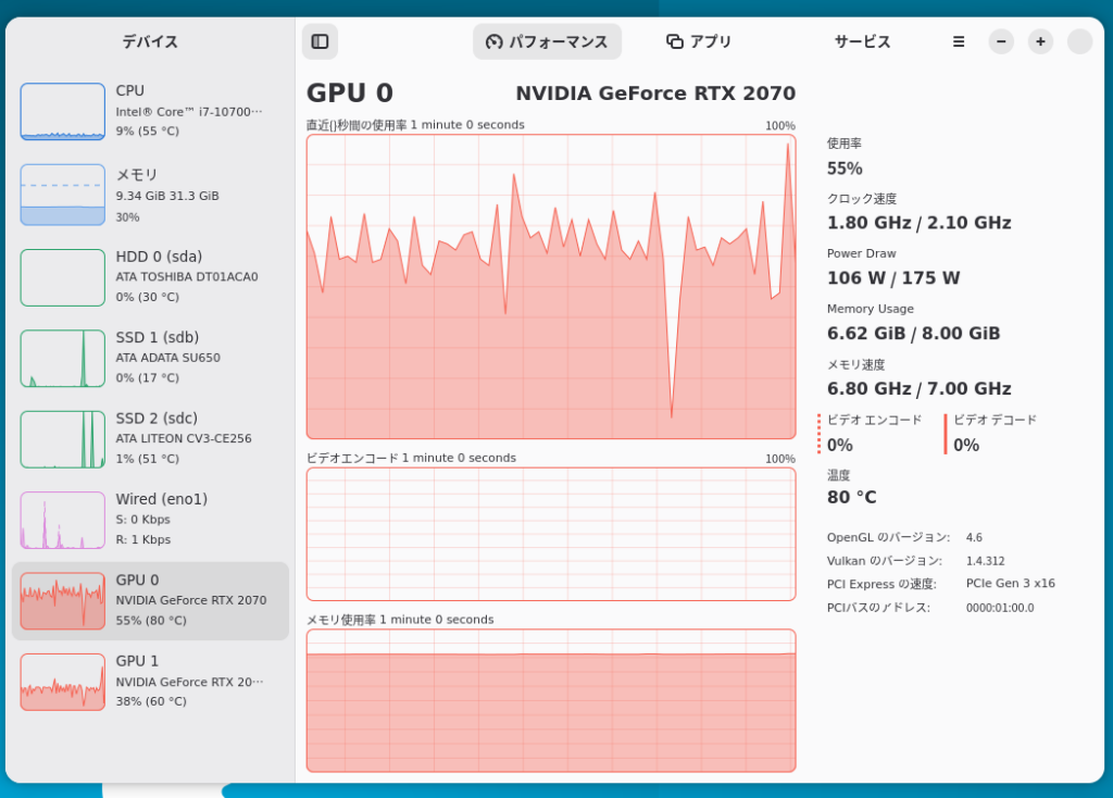 今回は2gpu構成ですがvramの部分が8gbしか表示されていません。しかし、missioncenterで確認するとしっかりモデルがセカンドGPUにも読み込まれていたので、特に何も設定せずに2gpuで学習できると言って良さそうです。