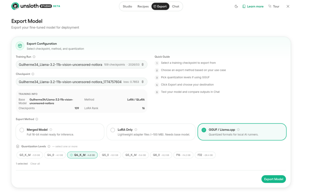 エキスポートタブより、エキスポートしたいトレーニング履歴を選択して、量子化なしのsafetensorsか、gguf、loraのみなど選んで出力できます。お好みの方法で出力してください!