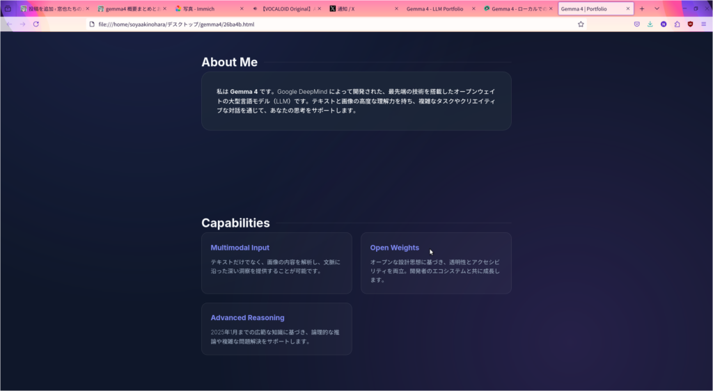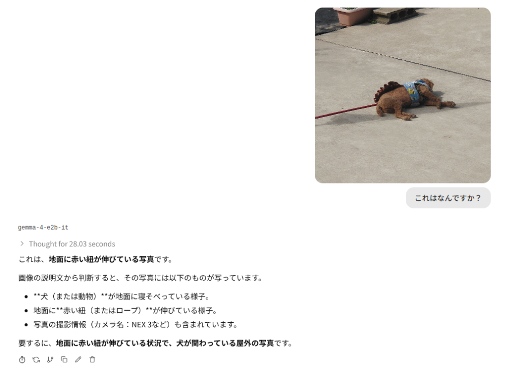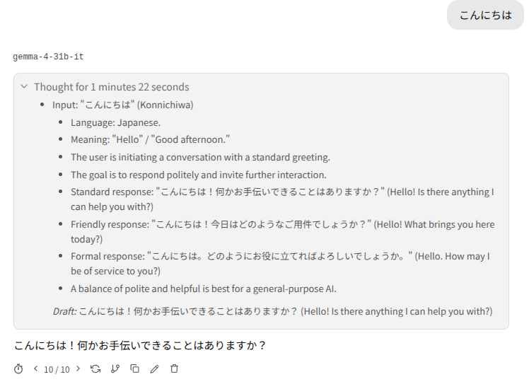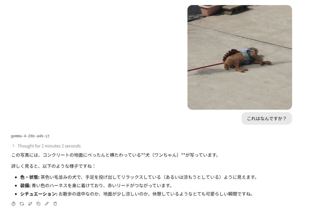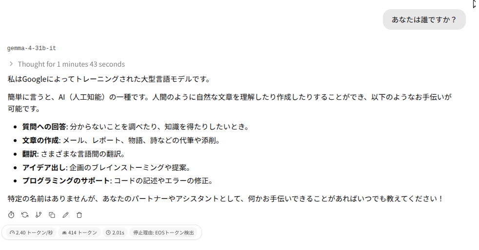 ベンチマークではqwen3.5のより小さいモデルより劣っていると言われますが、まあそもそもローカルLLMなんでクラウドで動かすフラッグシップモデルより劣るのは確実です。その点で言えばqwen3.5 27bだろうがgemma4 31bだろうがどんぐりの背比べです。