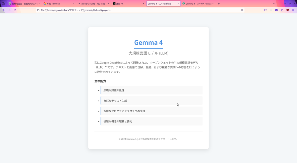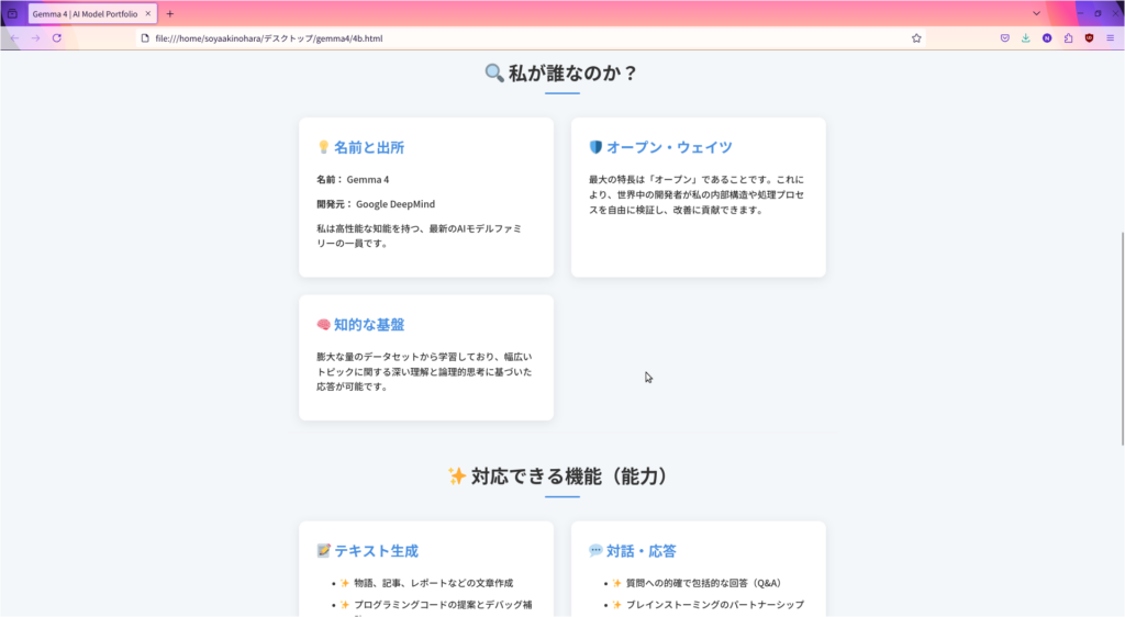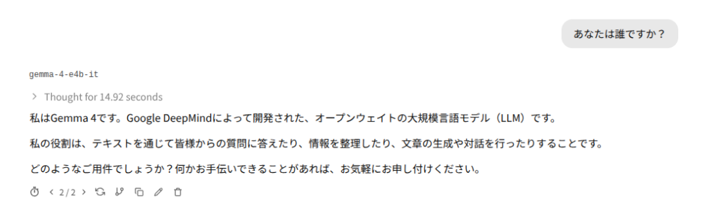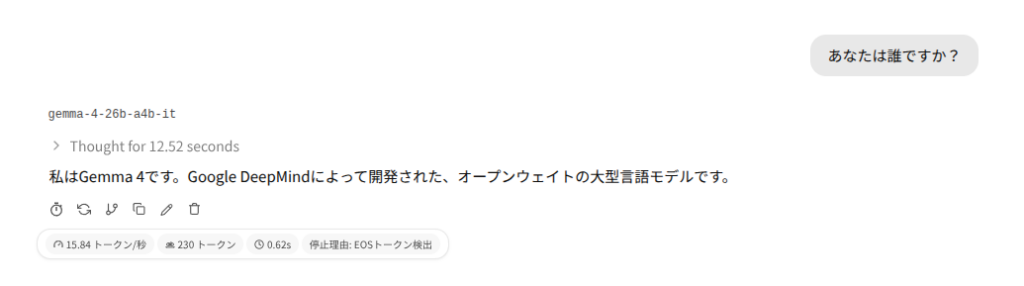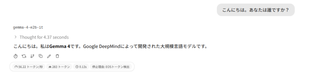 私は <strong>Gemma 4</strong> です。Google DeepMind によって開発された、最先端の技術を搭載したオープンウェイトの大型言語モデル(LLM)です。テキストと画像の高度な理解力を持ち、複雑なタスクやクリエイティブな対話を通じて、あなたの思考をサポートします。