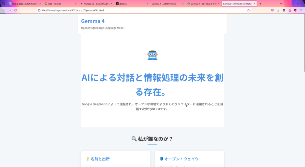 gemmaシリーズというのはgoogleが出しているオープンの小型AIモデルで、自分のパソコンに重みをダウンロードして実行したり、APIを叩いて試すことができます。今回はローカルで試します。