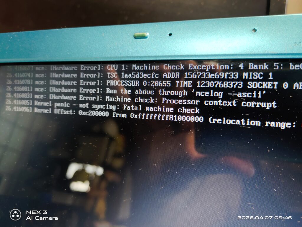 ここで問題が発生します。コアが物理的に一つ死んでいてカーネルパニックを起こしてしまいます。