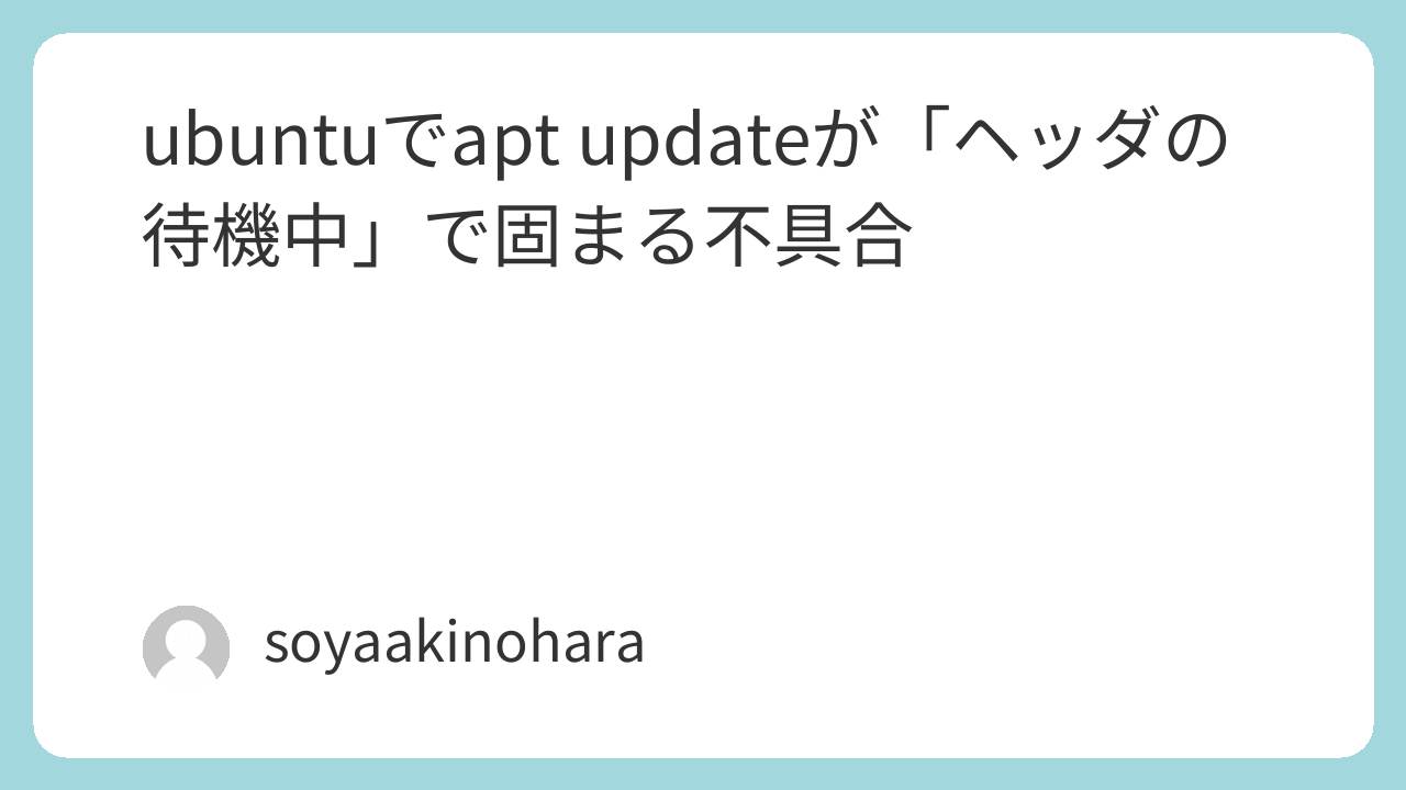 ubuntuでapt updateが「ヘッダの待機中」で固まる不具合 linux X Misskey Facebook0 コピー 2026.04.16 この記事は約1分で読めます。 対処法 /etc/apt/sources.list.d/ubuntu.sourcesにあるリポジトリのURLをhttpからhttpsに変更するとうまく行く。私の場合はこれで解決しました。 元投稿 Waiting for headers 0% by inUbuntu