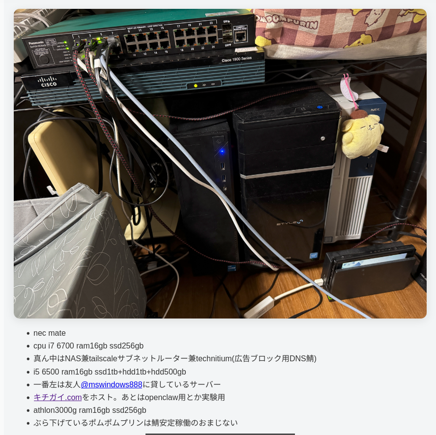 少し前からサーバーを強化して(3700xとか積みたいなあ)、数を減らして電気代を節約したいなあと思っていました。今まで使っていたサーバーは下の画像の通り(https://soyaakinohara.netより)